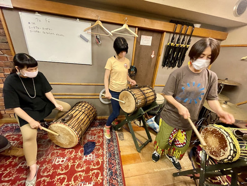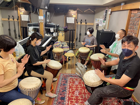 【ウォーミングアップ】 まずは基礎練習で肩慣らし! ☆主な内容 ・三音の叩き分け フレーズ練習 ・アンサンブル 【ソリスト練習】 目指せ!ジャンベソリスト! ☆主な内容 ・コール&レスポンス ・アンサンブルを使った実践練習 ・4拍、ハチロク系 【ソロ練習】 自分の想いをリズムに込めよう! ☆主な内容 ・古典的ソロフレーズのレクチャー ・フリーソロの練習 ・自分ならどんなフレーズを叩くか?考えてみよう! 【楽曲(メイン)練習】 アフリカのリズムにみんなでチャレンジ! ☆主な内容 ・ソロフレーズ、ブレイク、構成をレクチャーして、楽曲を完成させる ・過去曲の振り返り 【ライヴリハ】 ライヴに向けて一致団結 ☆主な内容 ・パート分け、演奏形態、構成を確定 ・演奏を繰り返して細かい微調整 【ドゥンドゥン練習】 リズムの要、ドゥンドゥンを学ぼう! ☆主な内容 ・縦、横、ダブルどれにも対応させる練習 ・ドゥンドゥンの掛け合い練習 【ダンス練習】 アフリカンダンスでパフォーマンスを華やかに! ☆主な内容 ・里美さんを招いてワークショップのおさらい ・既存曲のダンスの振り返り ・ソリストの育成 【うた練習】 言葉の意味を理解して、みんなで歌おう! ☆主な内容 ・うたのレクチャー ・うたの意味 ・演奏しながら歌う練習 【Percussion Studio レクチャー】 PCソフト"Percussion Studio"を使った音源作成講座。 ☆主な内容 ・お店でPCを使って音源作りをレクチャー ・課題を与えてみんなに音源作りに挑戦 【フォーメーション練習】 ライヴ演奏は見栄えが大切! ☆主な内容 ・立奏時のステップ練習 ・演奏時の立ち位置や手の動作の練習